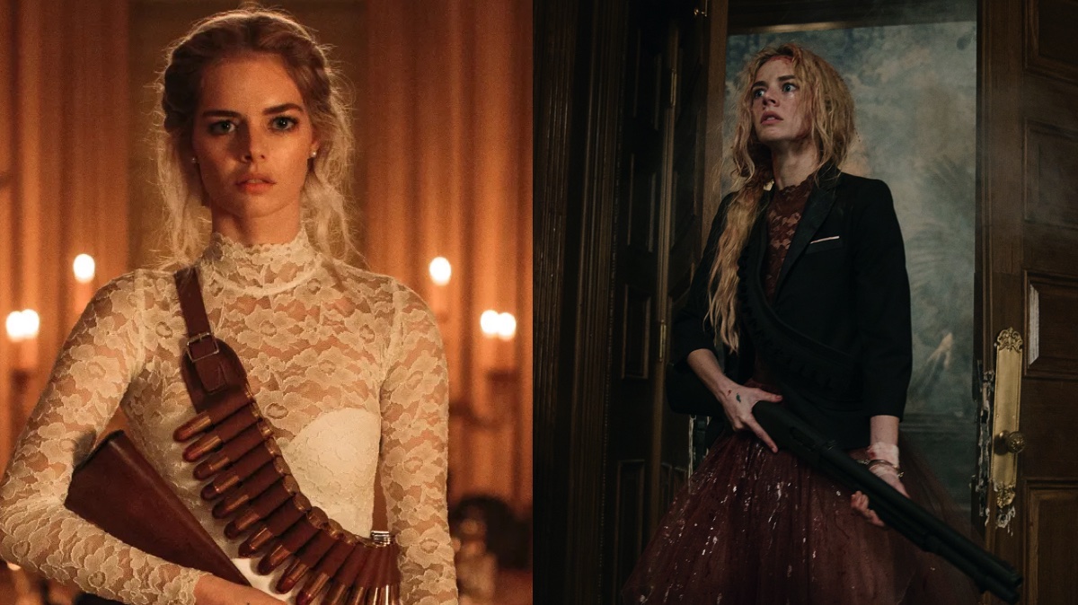 No primeiro filme, lá de 2019, o visual de Grace de Samara Weaving no filme, se tornou a marca registrada da personagem: um vestido de noiva, uma arma pendurada, e claro, o tênis amarelo.