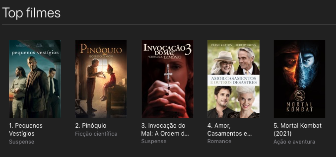 Os longas Pequenos Vestígios e Invocação do Mal 3finalmente chegaram nas plataformas digitais e ficaram nos primeiros lugares do período citado. Pequenos Vestígios fez uma breve carreira nos cinemas em Março e deve chegar na HBO Max em julho. Já Invocação do Mal: A Ordem Do Demônio fez sua estreia simultânea na plataforma da WarnerMedia e nas plataformas de aluguel e compra digital (sai por 49,90 reais o aluguel e 69,90 reais a compra).