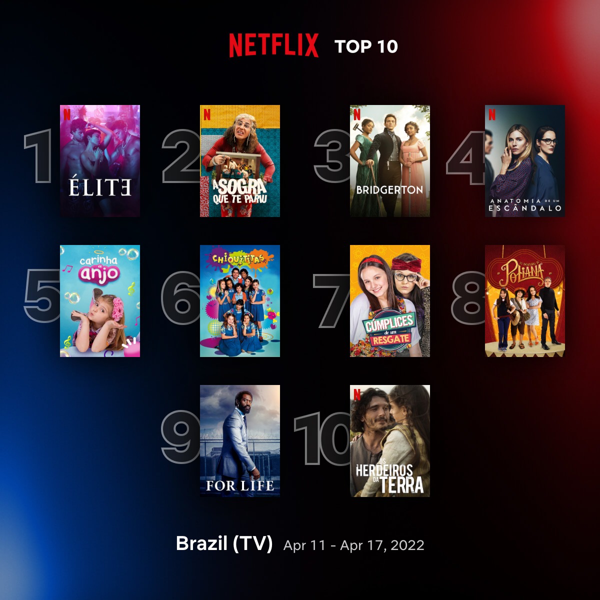 A Netflix atualizou o seu ranking de produções mais vistas na plataforma na semana passada (entre os dias 11 até 17 de abril).