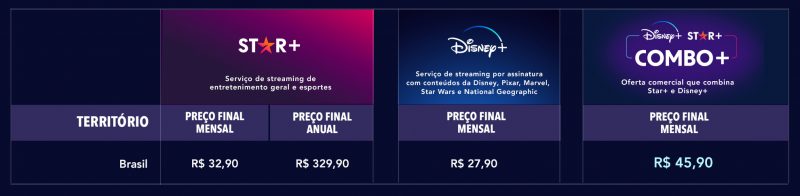 O Combo+ (assinatura do Disney+ e STAR+) fica em R$ 45,90.