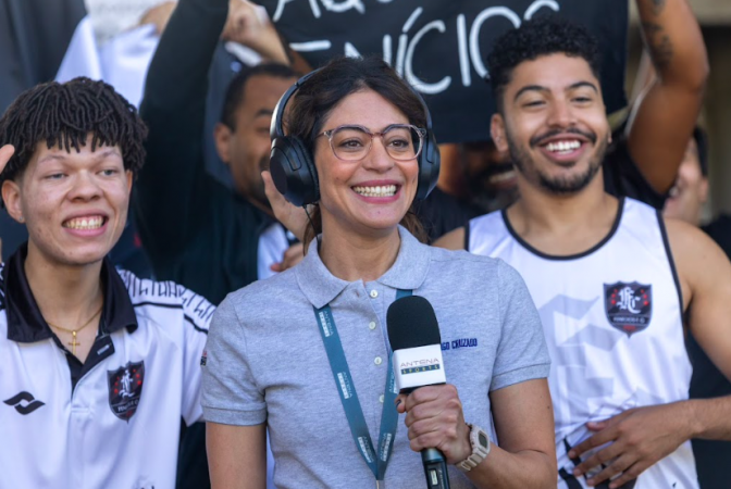 Eu falei sim. Eu tive uma uma vivência forte com a Dani Boaventura [jornalista] que faz uma participação inclusive na série, enquanto ela ainda estava na ESPN, então eu tive uma diária com ela, e não só com ela, mas com a equipe também, né? Que era o Pedro lá da ESPN e não vou lembrar o nome de todo mundo, mas foi muito interessante porque foi desde o início do dia, passando pela reunião de pauta, que é muito interessante de ver o quanto que não só o jornalista, mas o jornalista esportivo, então, que você tá lidando com jogadores que pode acontecer de tudo. Pode lesionar, pode ser preso, pode virar notícia por conta de uma pensão alimentícia ou porque, sei lá, foi para outro time, foi comprado, foi vendido.