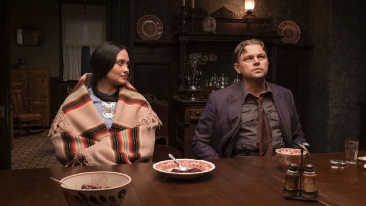 Na imagem temos Lily Gladstone e Leonardo DiCaprio. Na trama, Gladstone será Mollie Kyle uma índia Osage que é a herdeira de uma grande fortuna e DiCaprio será Ernest Burkhart, o sobrinho de um poderoso fazendeiro chamado William Hale (Robert De Niro) que usa a força e sua influência para tentar controlar a região que tinha virado um Estado propriamente dito apenas 1 década.