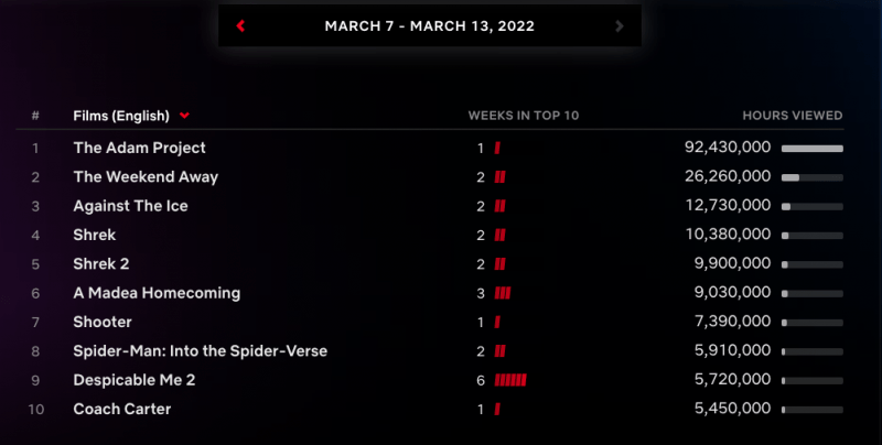 Estrelado por Ryan Reynolds, o drama sci-fi foi visto 92.43 milhões de horas e ficou em número 1 no ranking global.