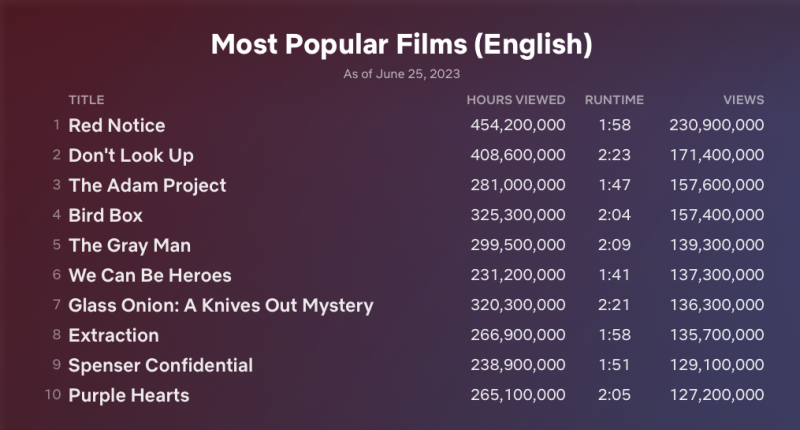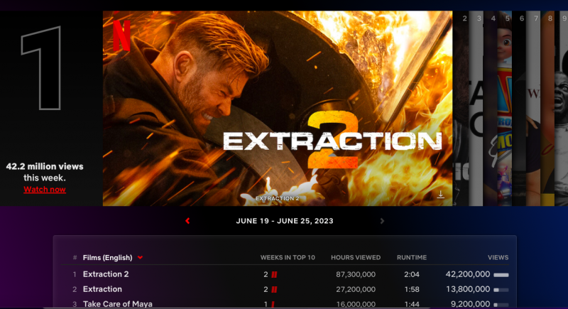 Em 20 de junho entrou no ar a métrica de visualizações (views), ou seja, para cada título a Netflix faz uma conta de quantas horas no total o programa foi visto e divide pela quantidade horas que tem. Ou seja, por exemplo, o longa Resgate 2 (que estreou na semana de 12 de junho de 2023) foi visto por 88,4 milhões de horas, é um filme com pouco mais de 2 horas. Isso dá para o filme um valor de 42,8 milhões de views.