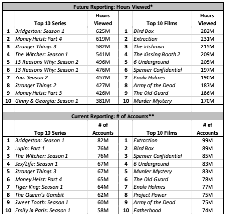 Por exemplo, no número de contas o longa O Irlandêsnem chega no Top 10 de contas, já no horas vistas, o longa está em terceiro lugar. A explicação, o longa de Martin Scorsese de 2019 tem mais de 3 horas de duração.