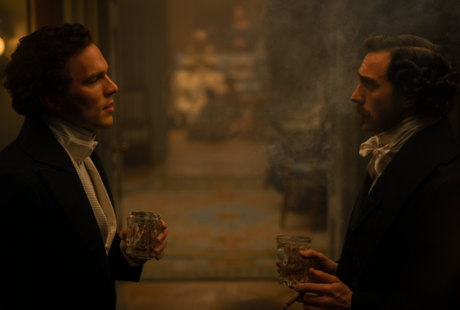 Com um trabalho de produção de fazer inveja a qualquer produção de época, Nosferatuaproveita para envelopar sua história com figurinos vitorianos pomposos ao mesmo tempo que boa parte das cenas colocam os personagens em roupas simples de noite. E se esteticamente Nosferatu empolga, tudo em volta parece se curvar, não é só os dedos longos e as unhas compridas do Conde Orlok(um irreconhecível Bill Skarsgard), para ajudar a contar essa história. Claro, o roteiro (também de Eggers) se estende um pouco ao fazer mistério sobre a identidade do misterioso nobre que contrata os serviços da empresa que o jovem e ambicioso Thomas (Nicholas Hoult, num bom ano) trabalha, mas sinto que serve seu propósito narrativo de criar uma tensão sobre a identidade, e o visual, do protagonista bebedor de sangue.