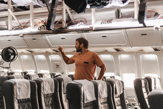 Se essa parede do avião não saísse, não dava. Todas as decisões de conforto, elas foram tomadas sempre visando ter um projeto que fosse filmado dentro de um avião com a sensação de que a gente tava no lugar documental, realista sobre a história, então todo tipo de conforto.