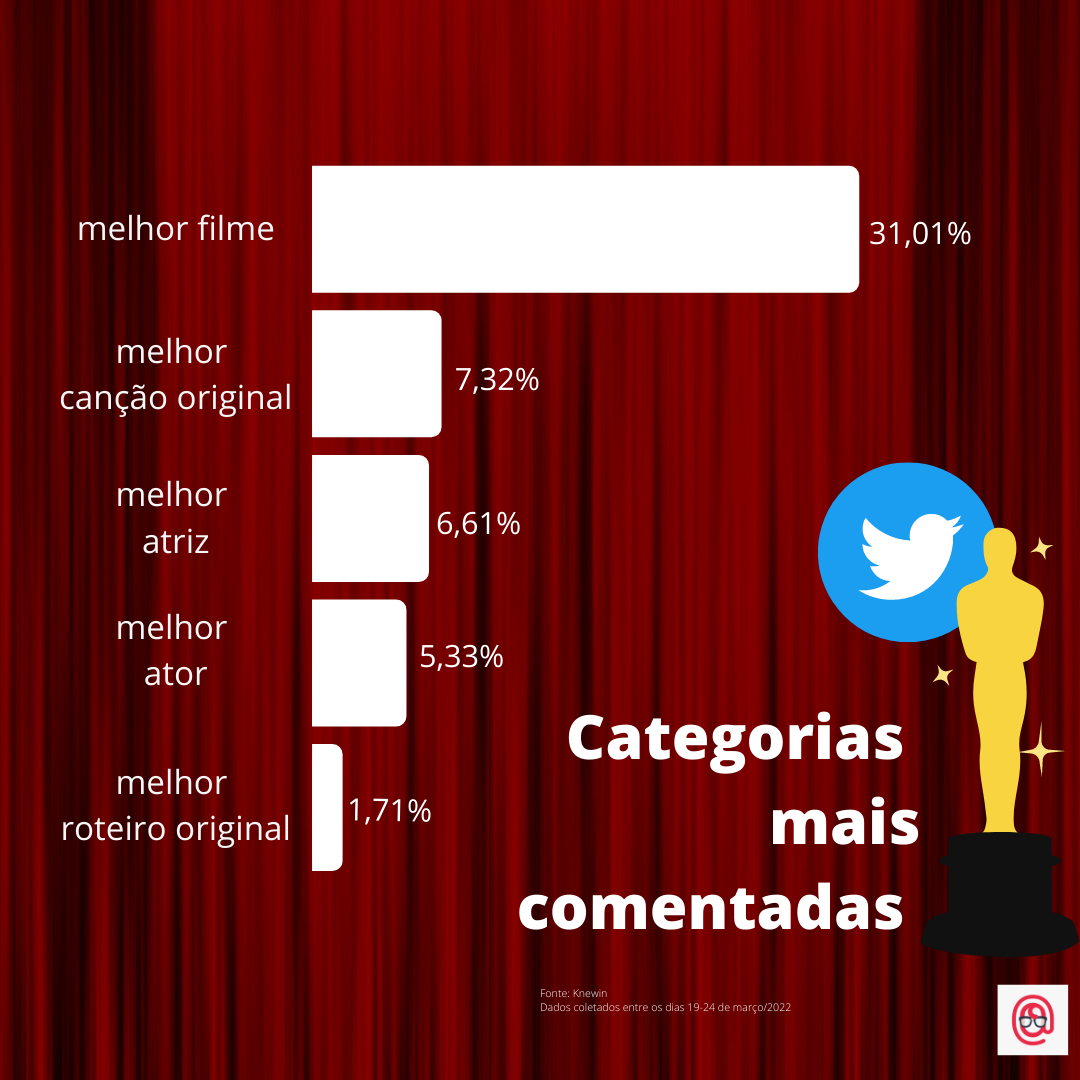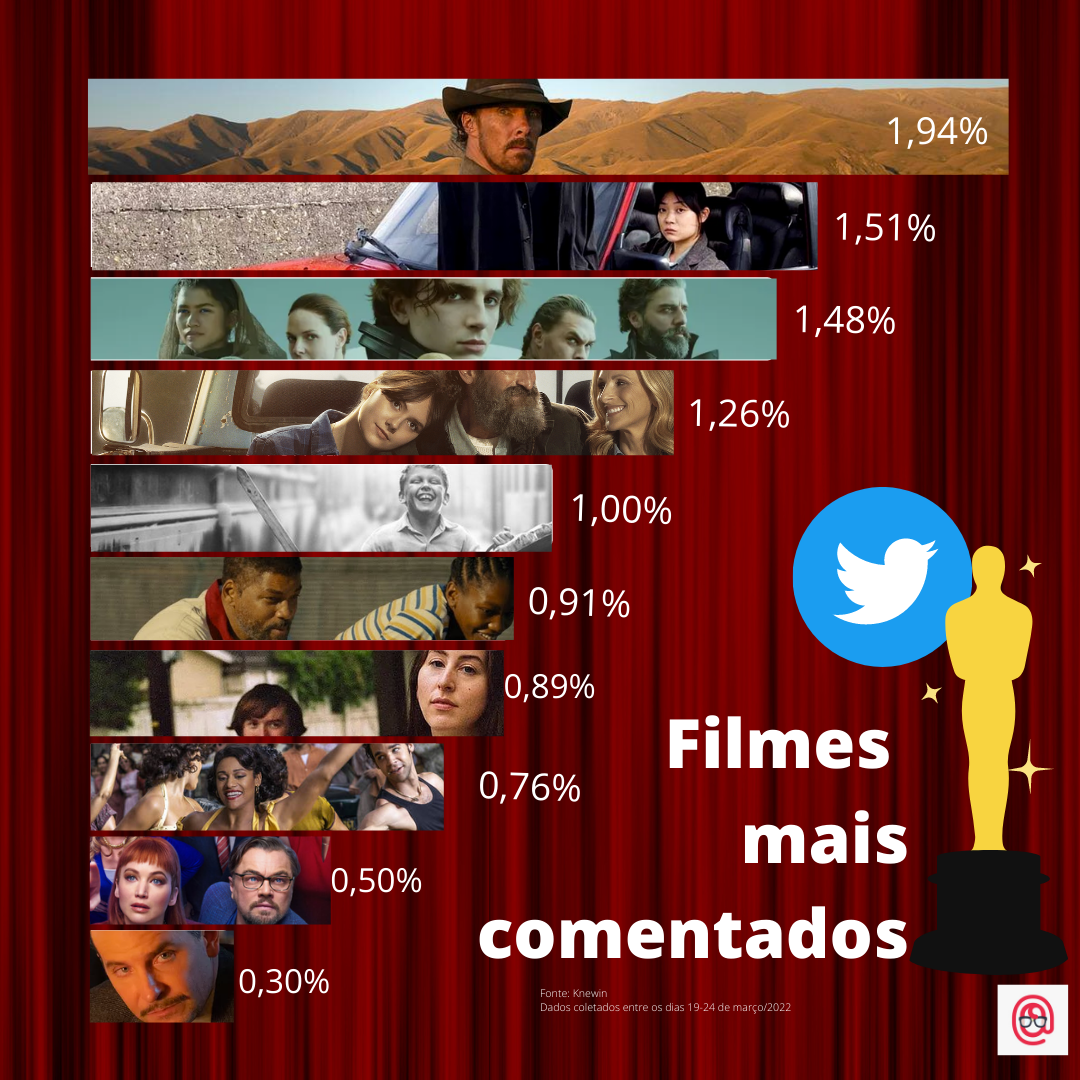 O que temos aqui? O resultado de uma pesquisa feita na rede social entre os dias 19 até 24 de março onde foram levantados quase 14 mil tuites sobre o Oscar. As tags da pesquisa foram #oscar, #oscars e #oscar2022.