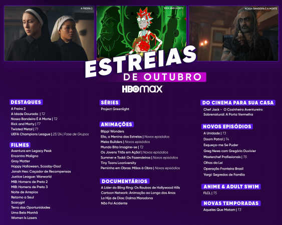 A HBO Max anunciou a lista de lançamentos do mês de outubro. Entre os destaques ficam com a chegada da série Twisted Metal no Brasil, os longas A Freira 2 e Sobrenatural: A Porta Vermelha e as segundas temporadas das produções originais HBO A Idade Dourada e também Nossa Bandeira é a Morte.
