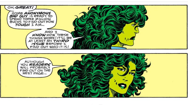 Assim, a publicação afirma que na série Jennifer Walters falará com o espectador, assim como ela faz nos quadrinhos da Marvel. O site ainda afirma que a personagem saberá que ela é uma personagem dentro do MCU e o seriado fará também a advogada interagir com pessoas reais.