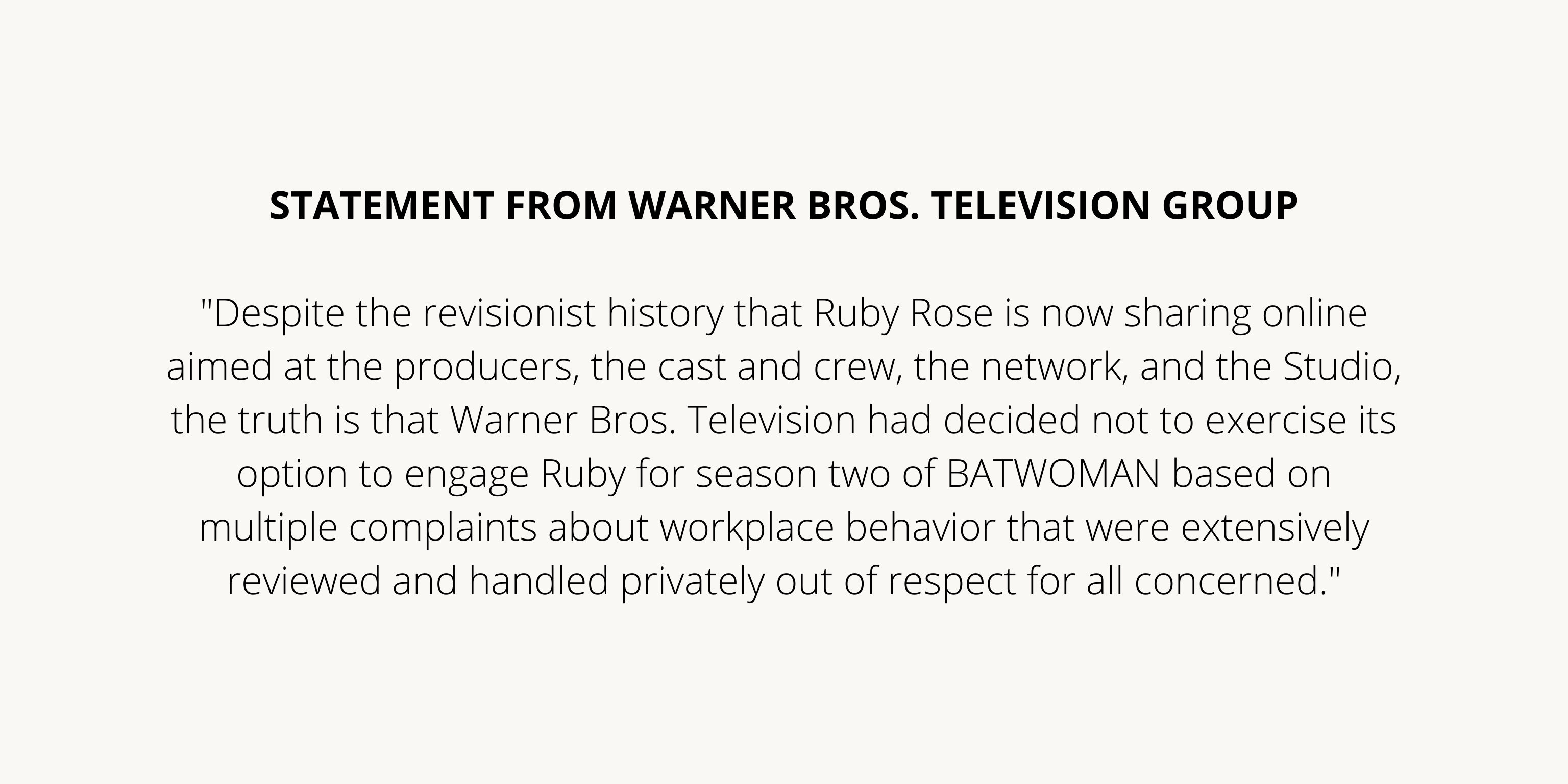 “Apesar da história revisionista que Ruby Rose está agora compartilhando online voltada para os produtores, elenco e equipe, a rede e o estúdio, a verdade é que a Warner Bros. Television decidiu não exercer sua opção de contratar Ruby para a segunda temporada de Batwoman com base em várias reclamações sobre seu comportamento no local de trabalho que foram extensivamente revisadas e tratadas em particular por respeito a todos os envolvidos“.